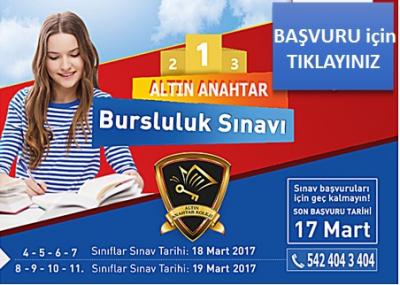 Altın Anahtar Koleji Bursluluk Sınavı başvuruları 17 Mart 2017 tarihine kadar devam edecek. Şu anda 4,5,6,7,8,9,1, ve 11. sınıfta okuyan öğrencilerin katılabileceği sınav 18 - 19 Mart 2017 tarihlerinde gerçekleştirilecek. Altın Anahtar Koleji Bursluluk Sınavına başvurmak için TIKLAYINIZ