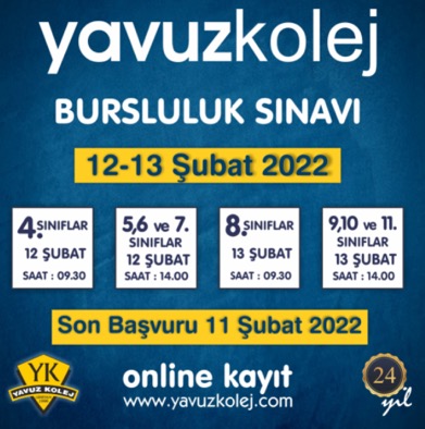Yahya Kaptan Koleji 2022 - 2023 eğitim öğretim yılı Bursluluk Sınavı başvuruları devam ediyor. Sınav 22 - 23 - 24 Ocak 2022 Cumartesi Pazar ve Pazartesi günü yapılacak. Önümüzdeki eğitim döneminde 5. 7. 8. ve 9. sınıf olacak olan öğrenciler için düzenlenen kapsayan Yahya Kaptan Koleji Bursluluk Sınavına katılmak ve kayıt yapmak için aşağıdaki linke TIKLAYINIZ.